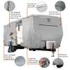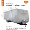 Extra strength PermaPRO ripstop fabric repels water and protects against dirt and sun damage. Air vent system and quick drying PermaPRO fabric combine to reduce wind stress and vent inside moisture. Adjustable front and rear tension panels and elasticized hem corners provide a custom fit. Zippered panels allow access to the RV doors and storage compartments. Long zipper pulls reduce the need for a ladder. Integrate strap attachment and weighted toss bag system eliminates crawling under the RV to install the tension straps. Tension panels reduce cover stress when tightening the straps. Zippered storage bag expands for easy packing. 4 Year Warranty. Fits Travel Trailers 24' - 27' length, 118" max height.